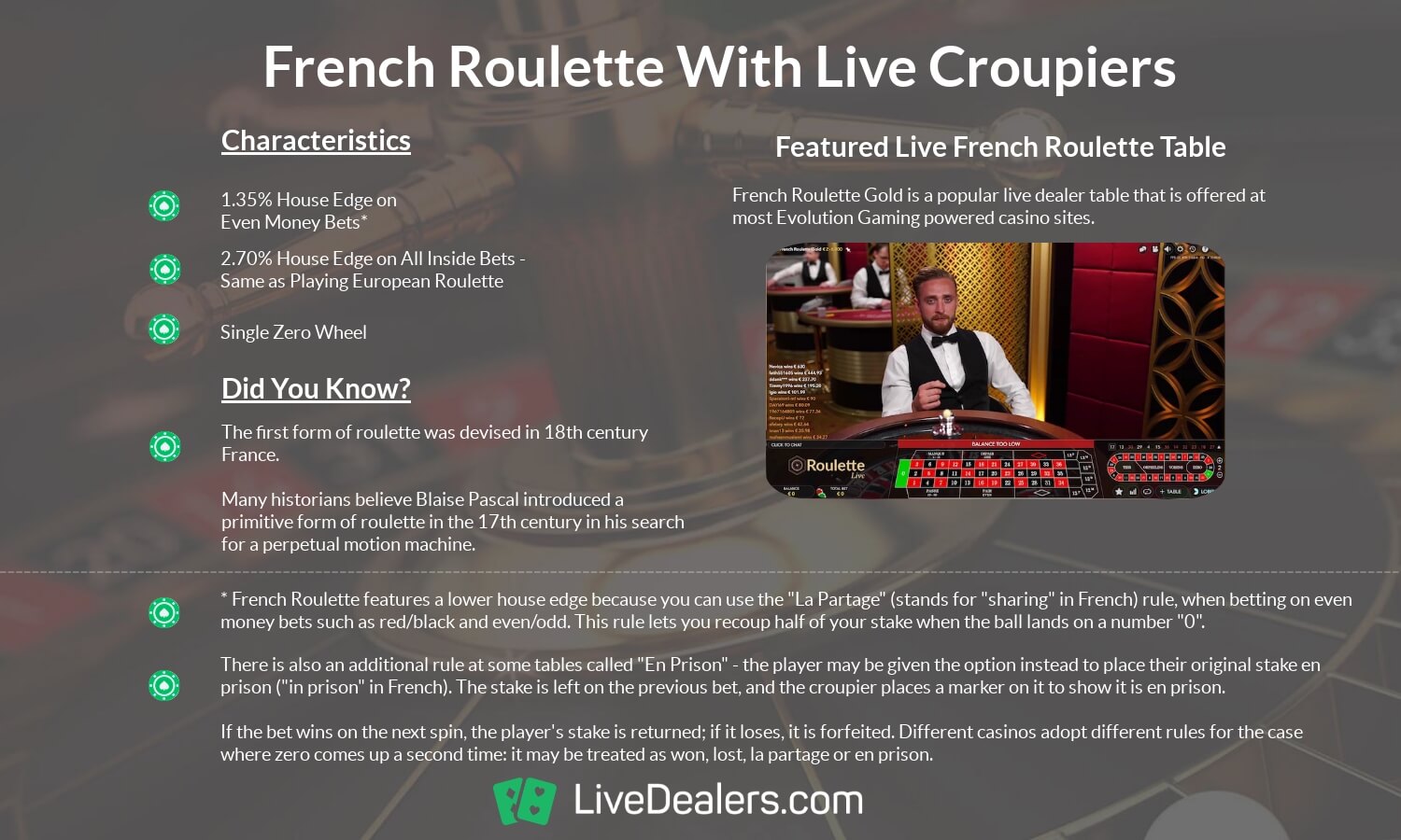 French roulette is often quoted as being the roulette game of choice for those connoisseurs of the genre. Compared to American roulette and European roulette you’ll find that the house edge is the lowest within French roulette, coming in at 1.35% when you consider the La Partage Rule that is in action here. Playing for real money with live dealers is an exciting prospect, and French roulette is the most popular version of the game.