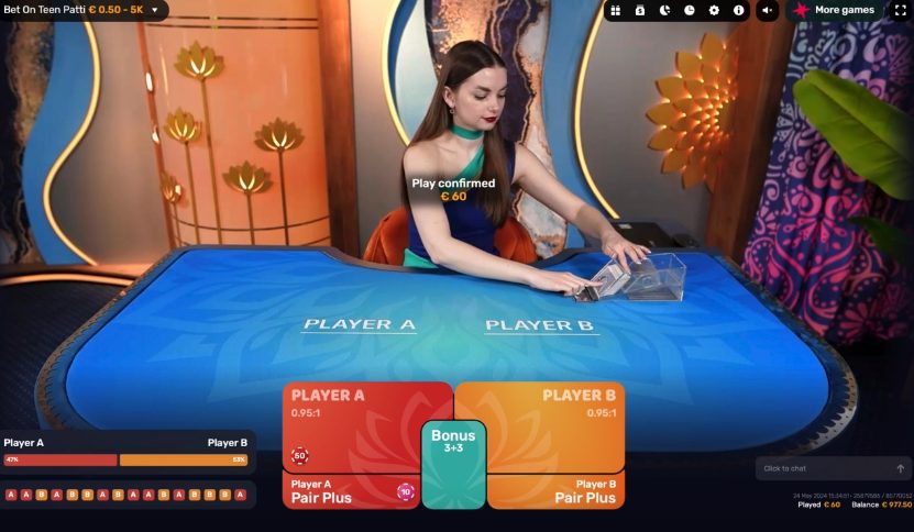 Live dealer games like Bet on Teen Patti aren’t typically available in demo mode at online lobbies. However, you can always join a live table without placing a bet and observe how the game works, or place a very small bet. Thanks to the low minimum bet thresholds (often just a few rupees), you can start playing with small stakes without taking big risks.