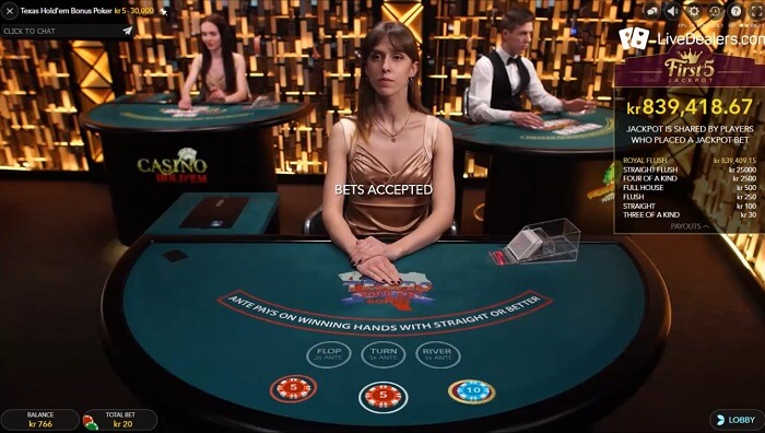 Live Texas Hold’em Bonus is Evolution’s game variant played against the house and accepting no bets after the River card. All players play the same hand, though each can obviously make their independent decisions. Both you and the dealer will start off by receiving 2 hole cards, yours dealt face-up and your opponent’s face-down.