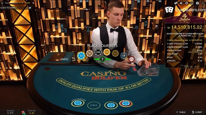 Live Texas Hold’em variant, part of Evolution Gaming Jumbo 7 Jackpot program