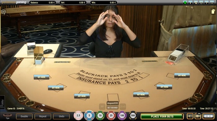 Oracle Lounge Blackjack is Portomaso’s 7 seat game streamed live from a studio located within the Portomaso Casino complex. Players can select either Full Table or Classic mode and change back and forth at any time during the game. Using buttons on the bottom of the screen, they can double, repeat or undo their bets, and manage audio and video controls. Icons at the top offer access to user statistics, Bet Behind settings and game rules.