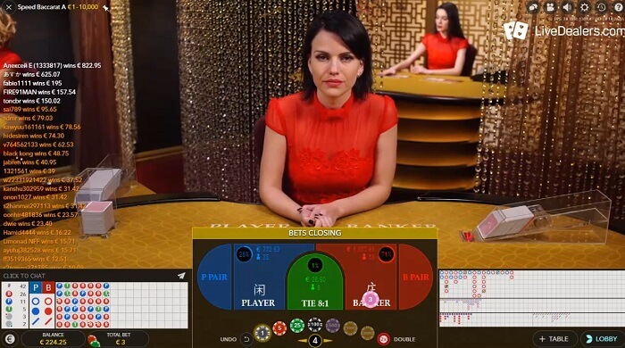 Some Baccarat fans, myself included, like moving from one round to the next as quickly as possible. Fortunately, Evolution Gaming obliges. Not only have they shortened time available for placing bets by a third, they also got the dealer to speak faster, taking as little time as possible to announce results and start dealing a fresh set of cards. One can still take advantage of numerous side bets and as a result collect payouts as high as 200:1.