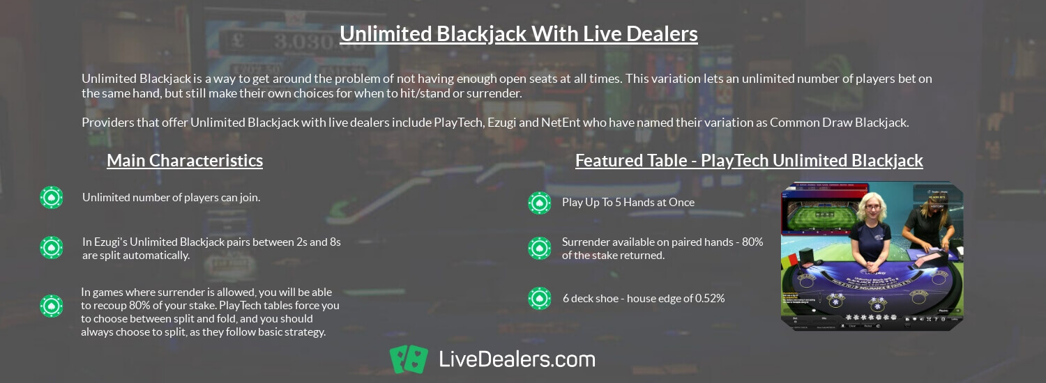 Enter, Unlimited Blackjack. Sometimes also called Common Draw Blackjack, this game variety solves the above problem by allowing unlimited players to bet on the same hand – while still making their own bet choices.